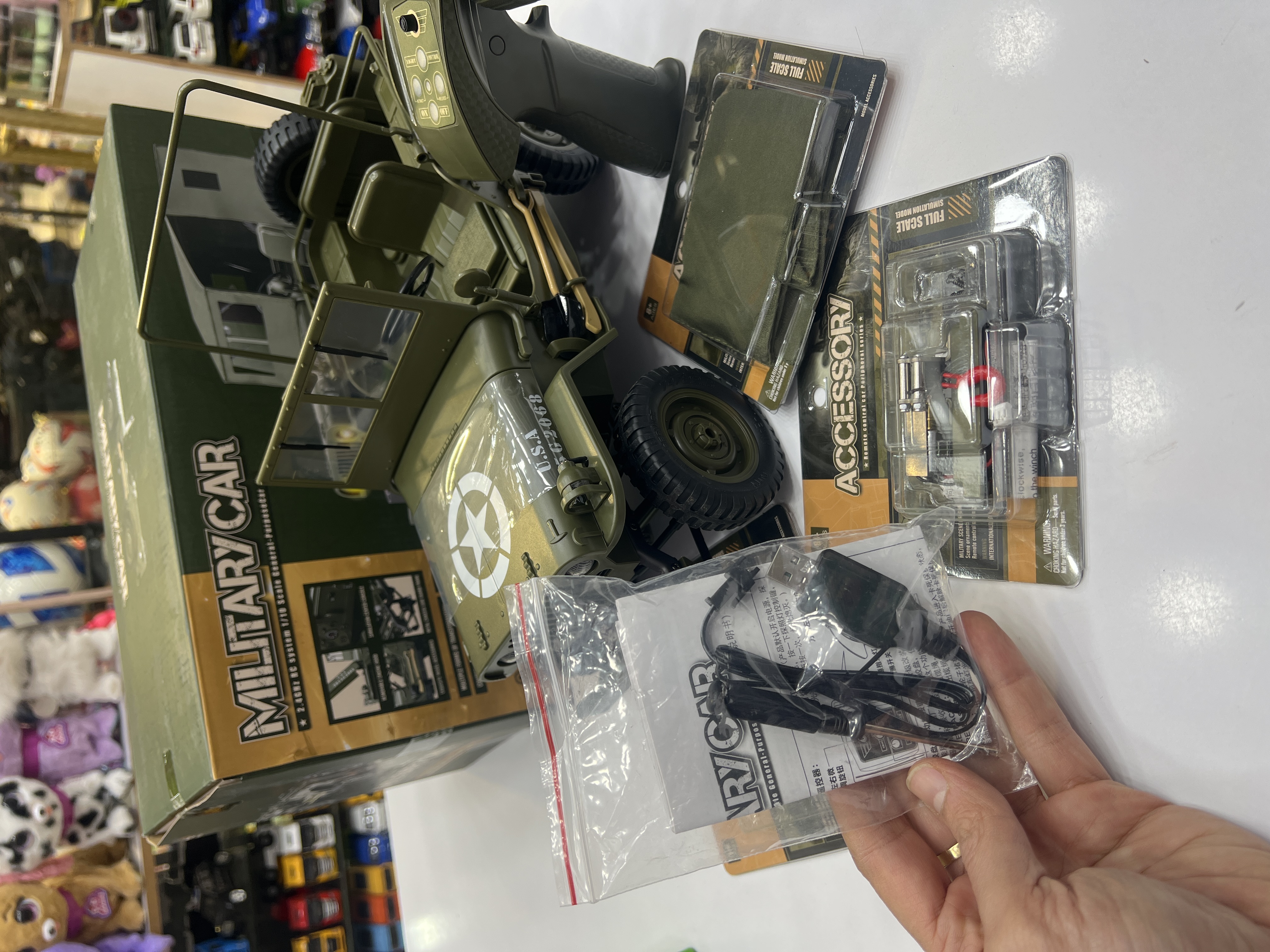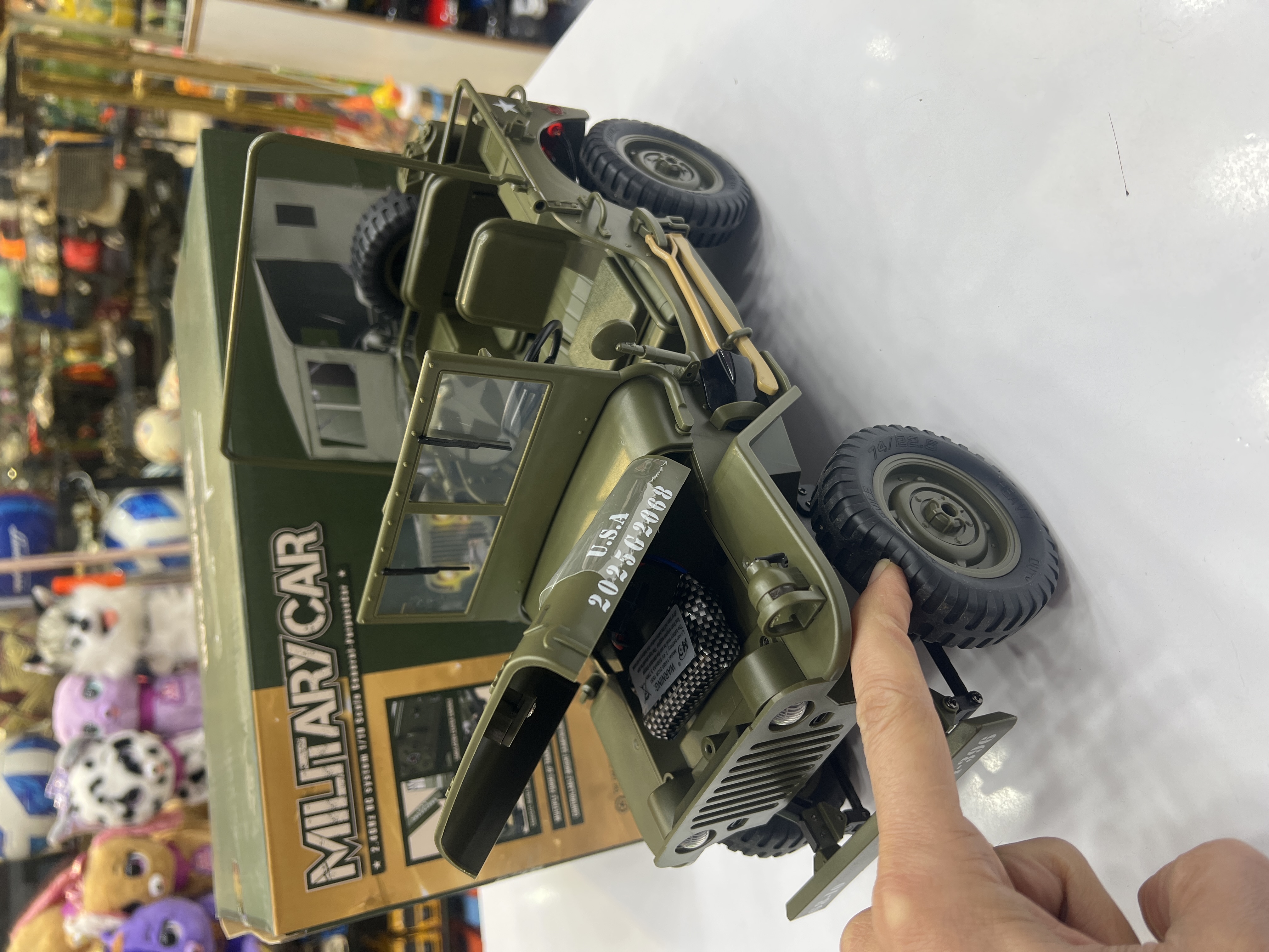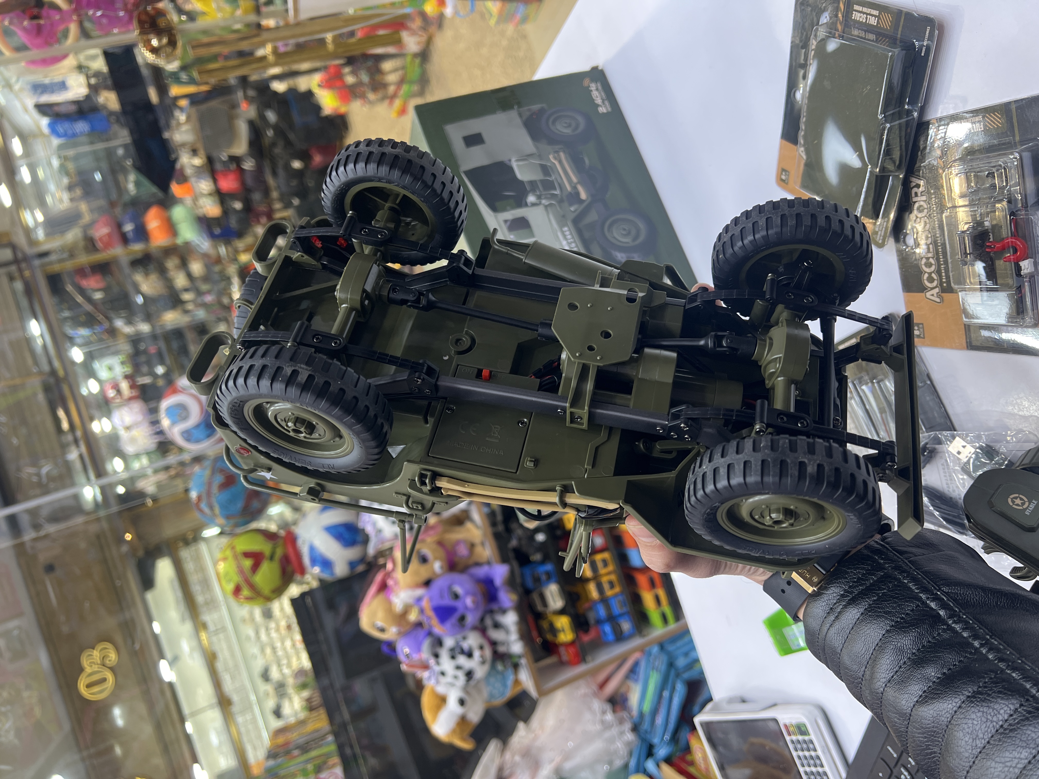 جیپ ویلیز  کنترلی اسکل ۱/۱۰ باطری دوصل وینچ فلزی کار میکنه ستون ماشین و گاردن فلزی لاستیک های گوشتی نرم شیب ۴۵ درجه تریم لاستیک و کنترل۲/۴ بدون تداخل رادیویی چادر دارد پروژکتور داره لایت نوری …..